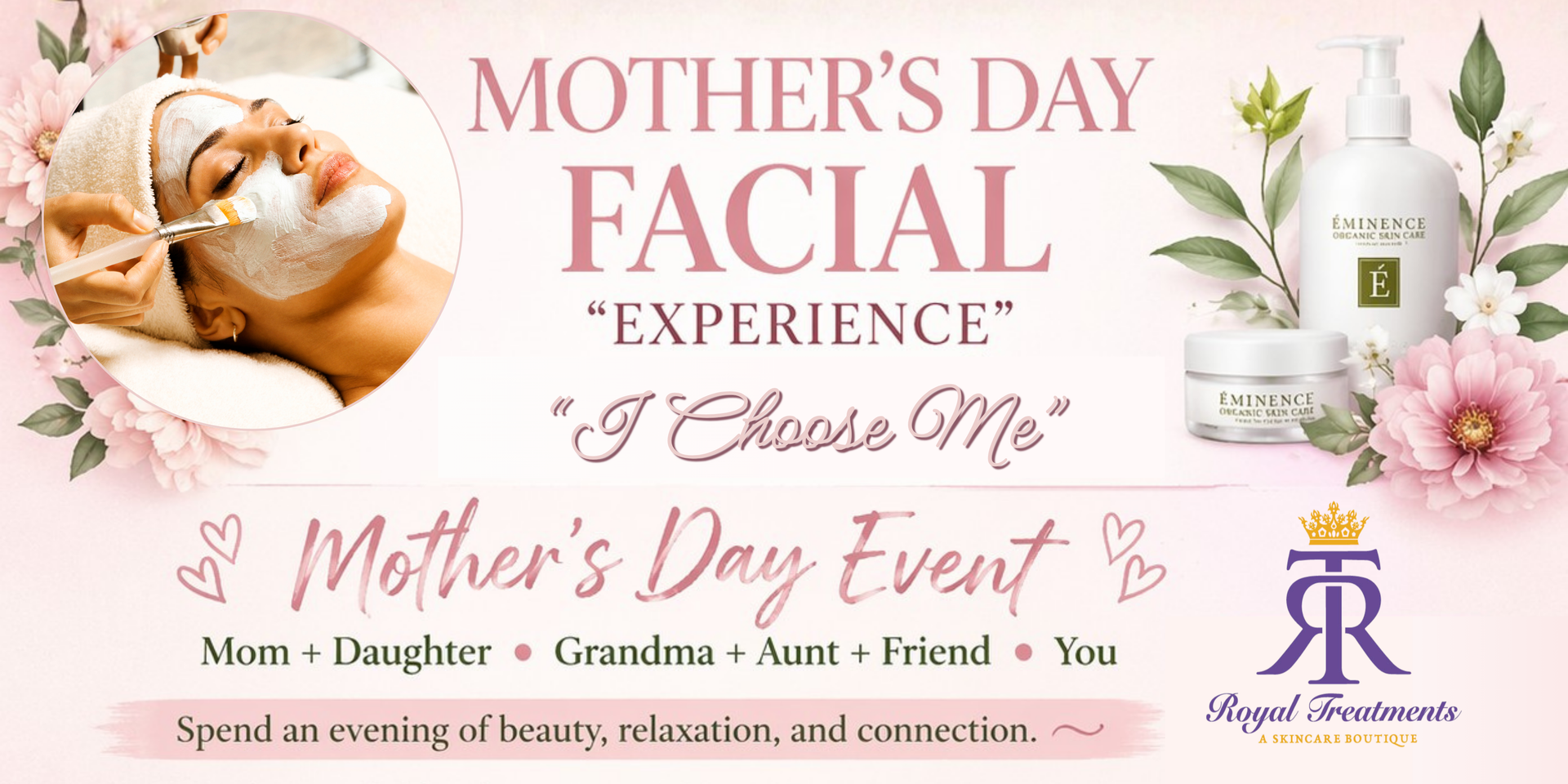 Join for a guided facial experience led by Reba Gaines LE, Owner of Royal Treatments Spa. You'll follow along step -by-step, using Eminence Organic Skin Care, while learning the benefits of each facial stage while enjoying a soothing, sensory self-care-ritual, and leaving with a radiant glow.